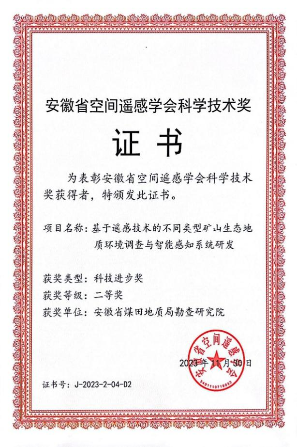 安徽省煤田地质局勘查研究院荣获“安徽省空间遥感学会科技进步奖二等奖”