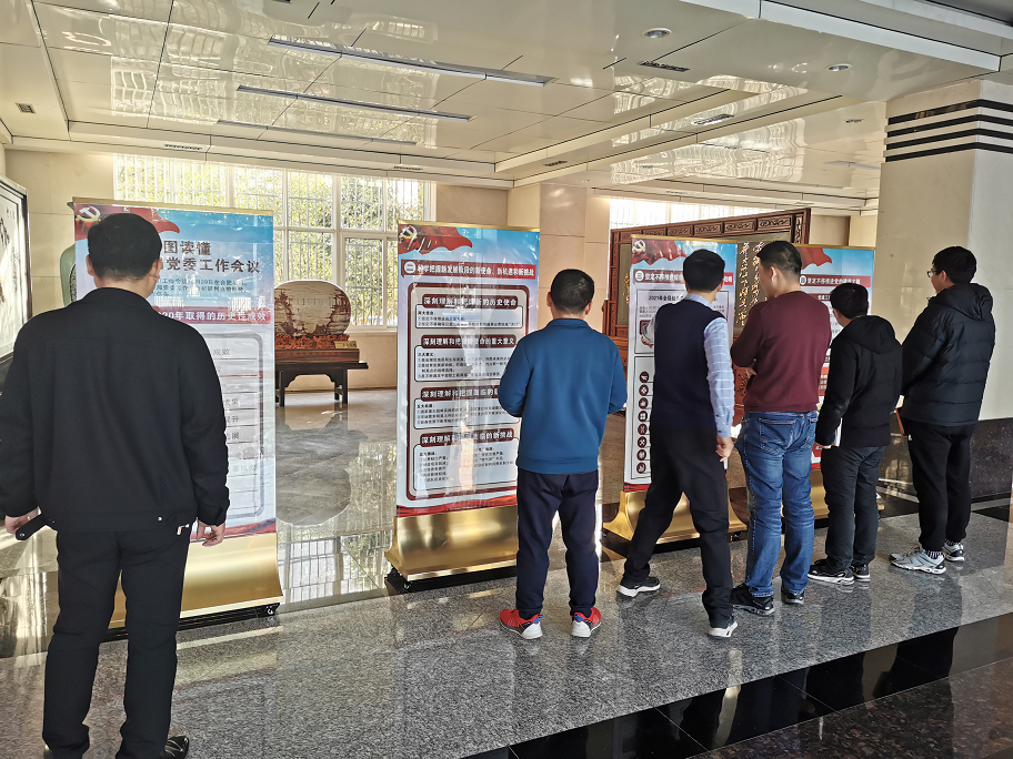图为组织党员干部观摩学习2021年局党委工作会议宣传展板