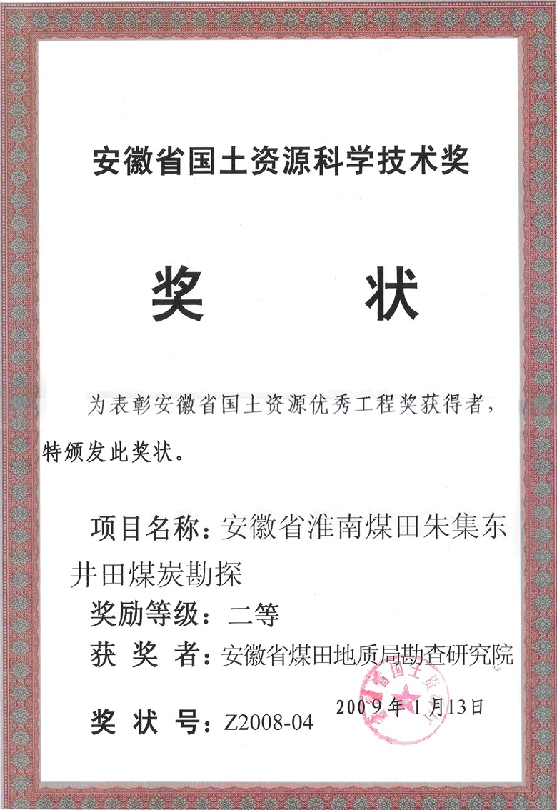 《安徽省淮南煤田朱集东井田煤炭勘探》-安徽省国土资源科学技术奖